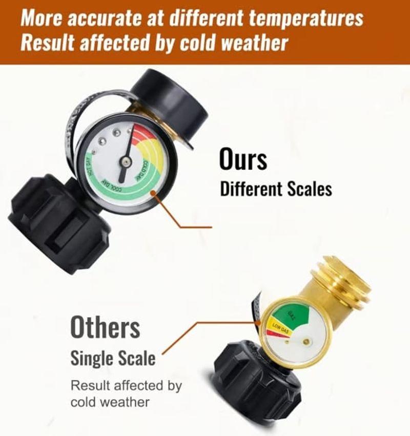 COLORED & RELIABLE GAS MONITOR – Colored reading allows you to check the gas level at a glance. Needle in green area means sufficient gas, yellow means low gas, and red means nearly empty gas. Through detecting air pressure, the propane tank gauge measures remaining capacity of propane. This propane gauge can also work as LEAK DETECTOR.