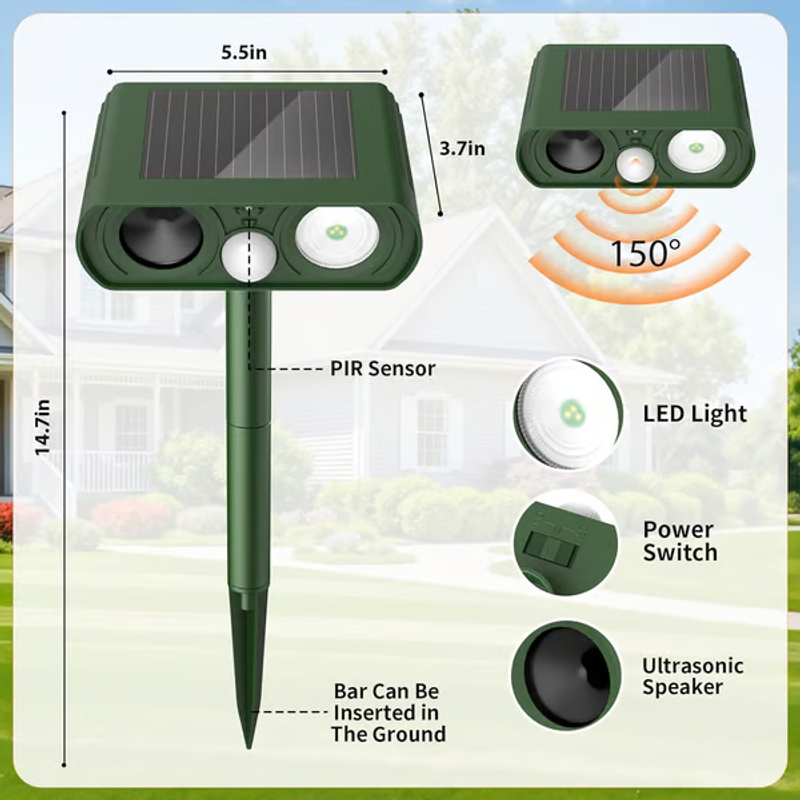 Once the advanced motion sensor detects animals nearby, the deer repellent devices activate, emitting strong ultrasonic sounds and flashing LED strobe lights.